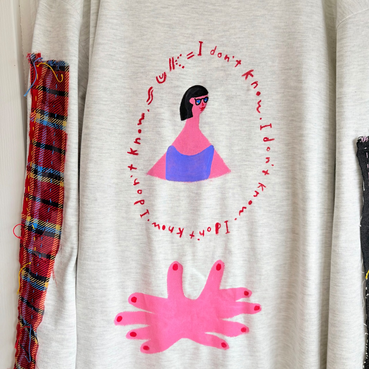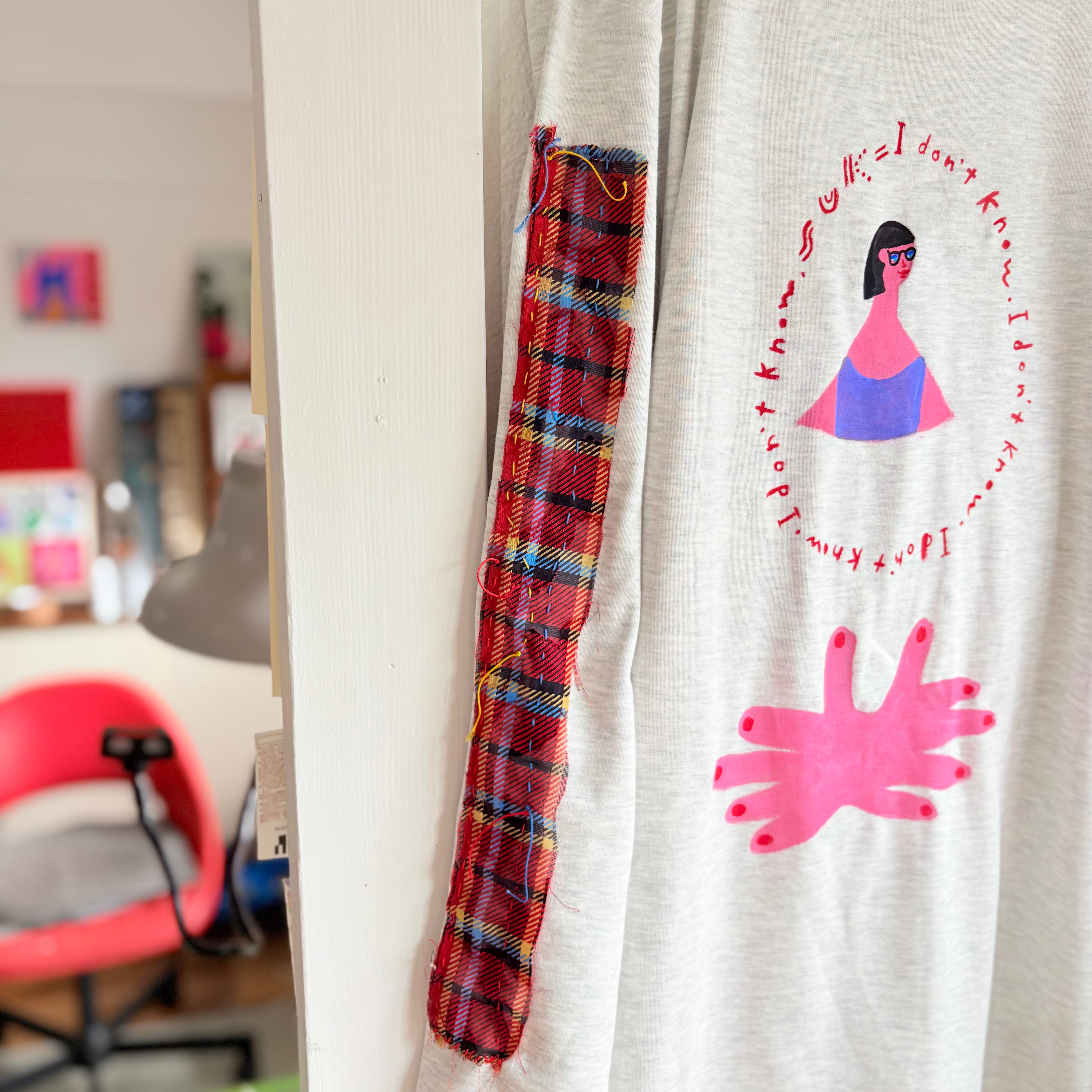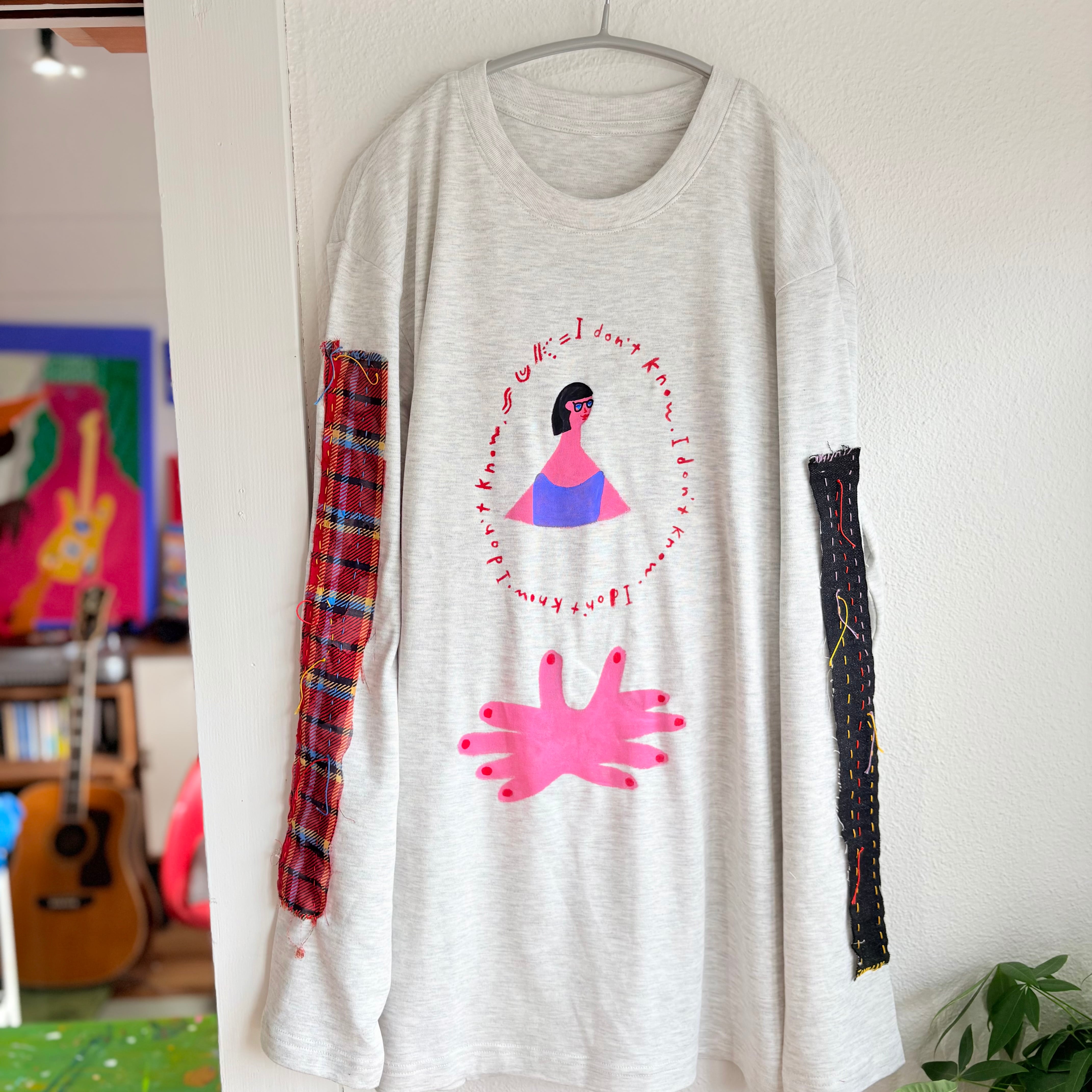 "アイドンノウガール袖に赤チェック"