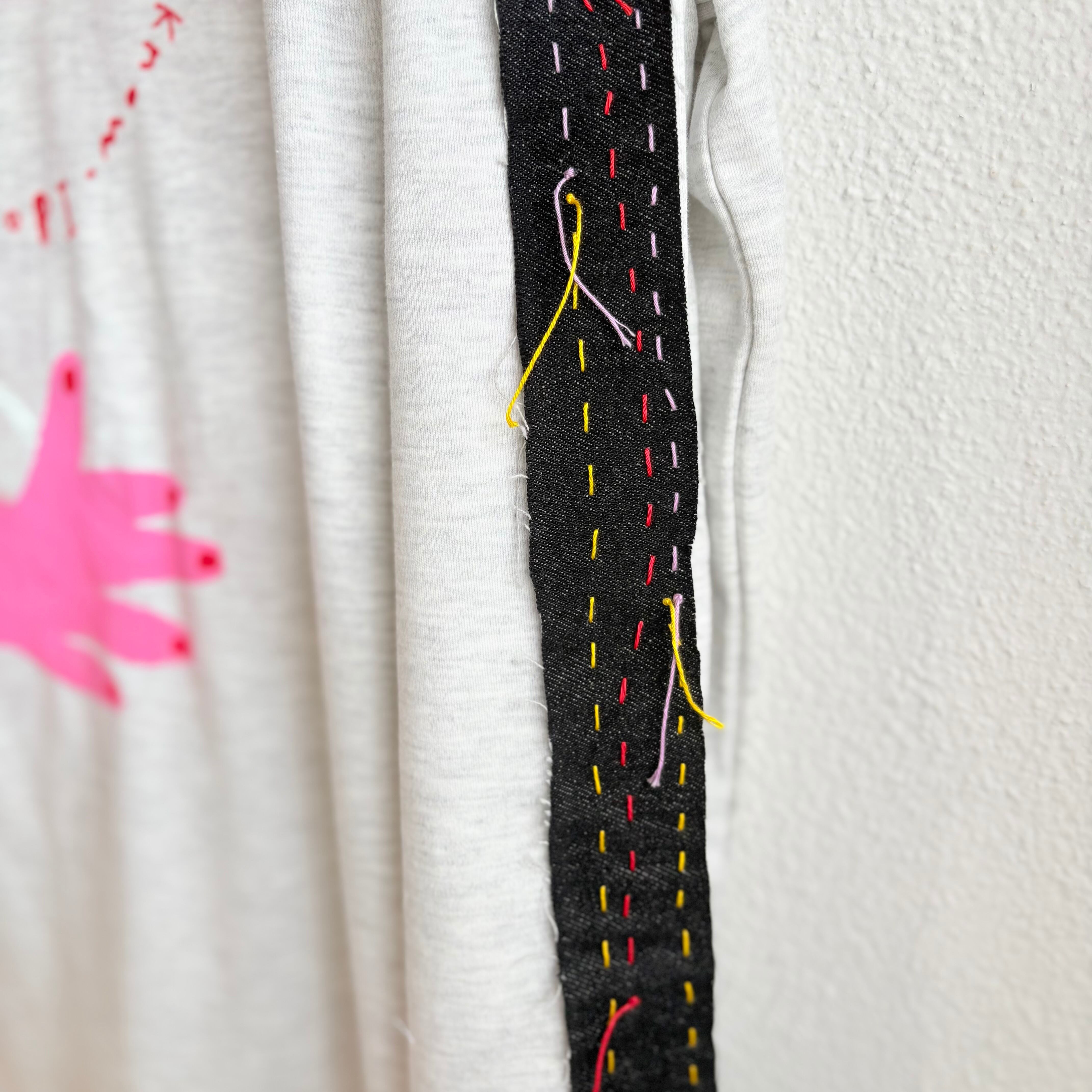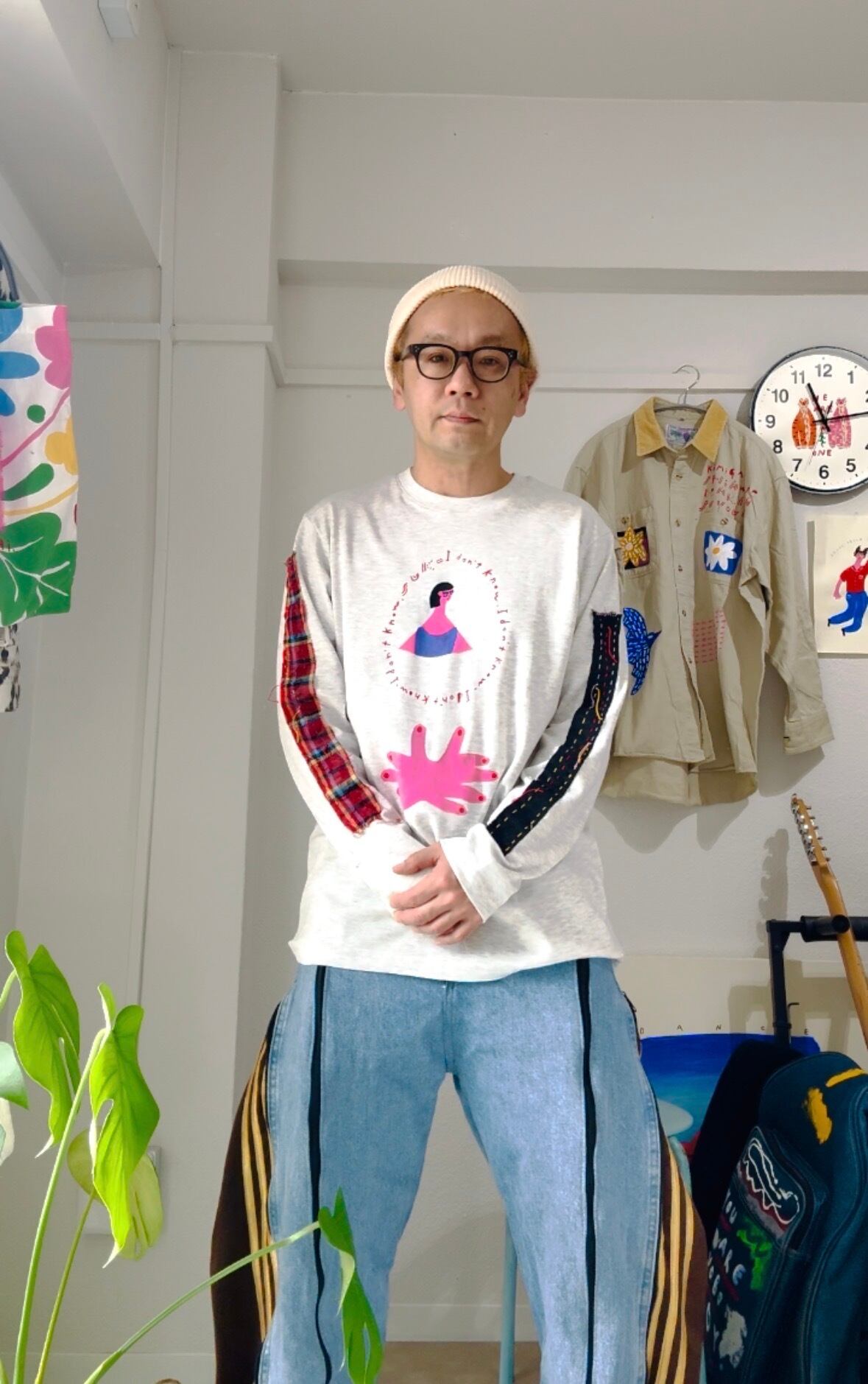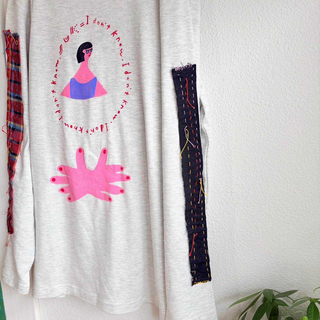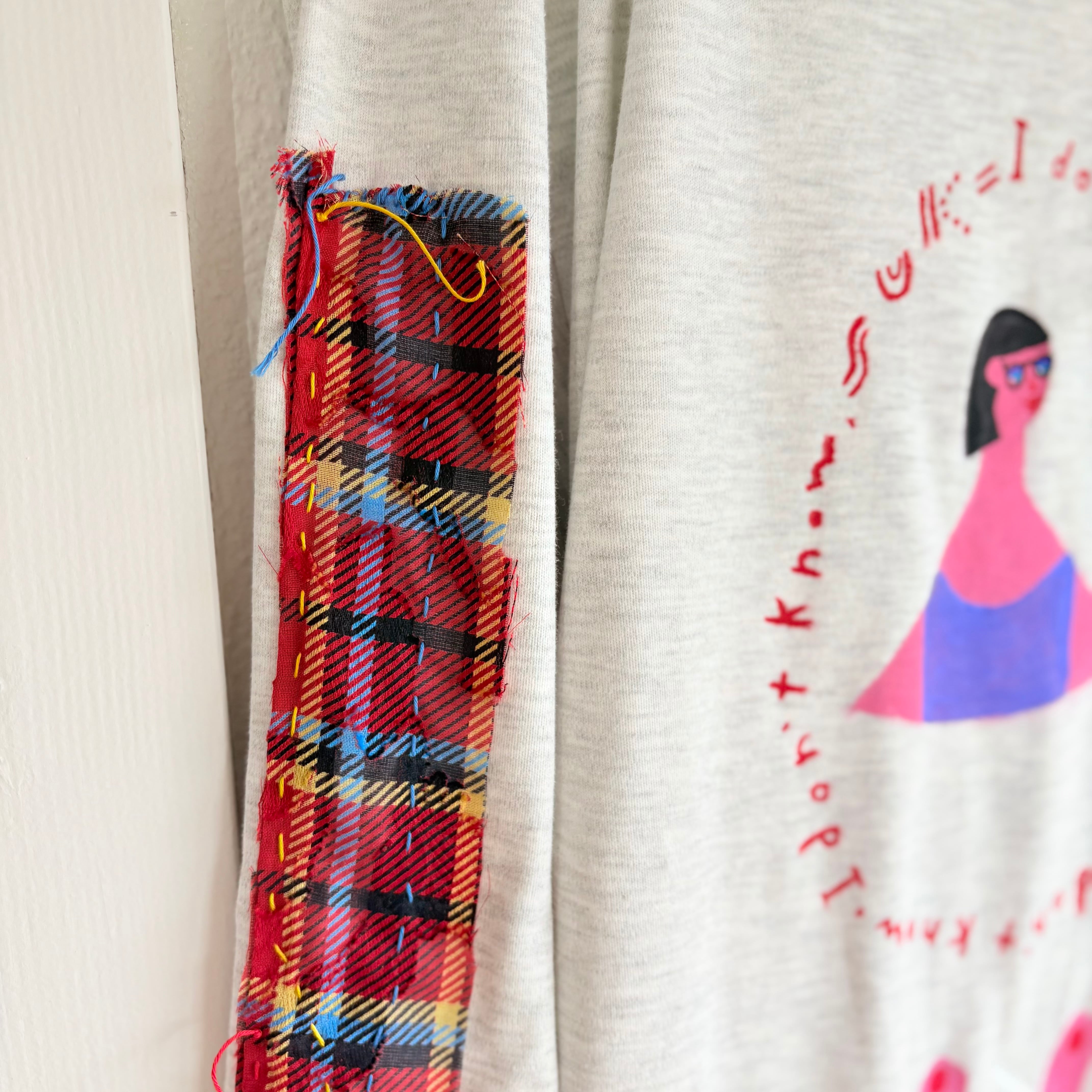"アイドンノウガール袖に赤チェック"